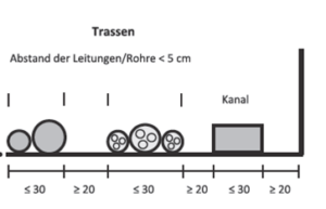 Von den Wänden brauche wir Minimum 20 cm Abstand und zwischen den Trassen die maximal 30 cm breit sein dürfen ebenfalls 20 cm Abstand siehe Bild